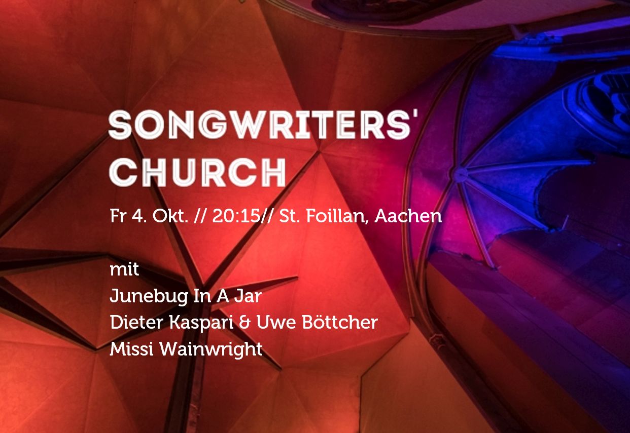 Wir freuen uns nach langer Pause wieder zur Songwriters Church, dem lockeren Mix aus Interview und Konzert in der einmaligen Atmosphäre von St. Foillan, einladen zu können. Auf der Bühne stehen Junebug In A Jar und Dieter Kaspari & Uwe Böttcher; durch den Abend führt Missi Wainwright.