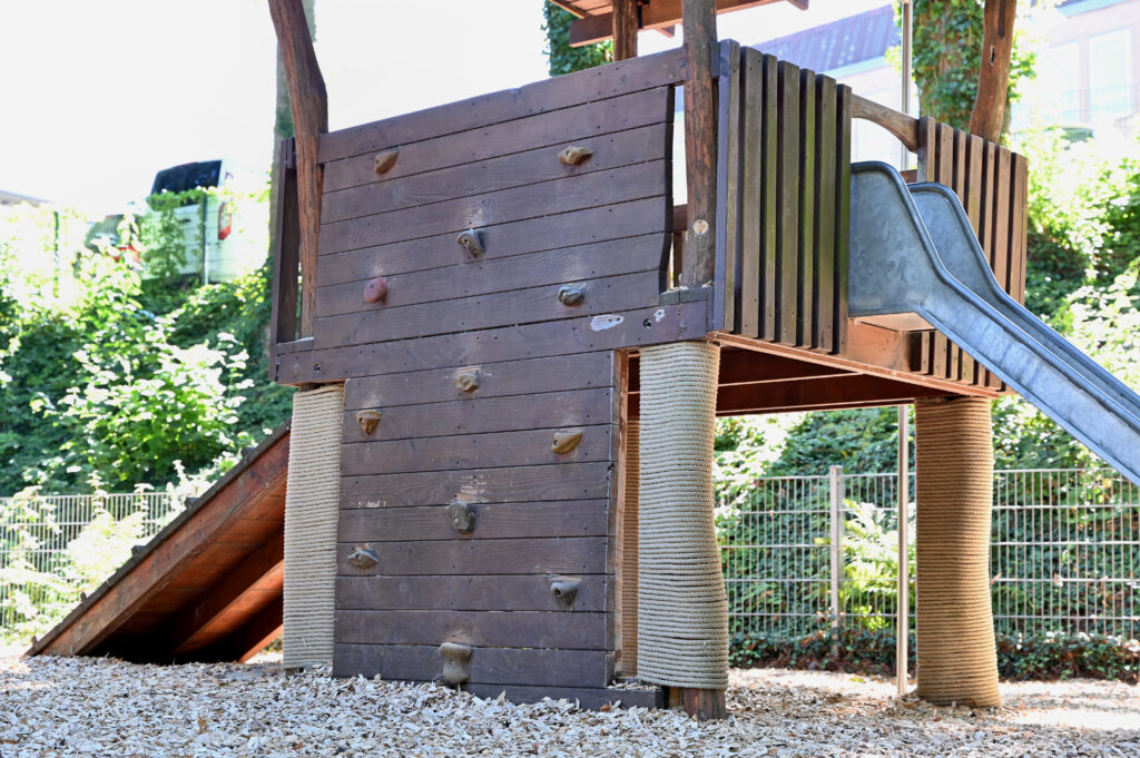 Die Einrichtung wurde 2002 umgebaut und 2013 auf die Bedürfnisse der U 3 Kinder erweitert . Den Kindern stehen jeweils ein Gruppenraum mit Nebenraum , ein Mehrzweckraum der als Bewegungsraum dient, sowie zwei Außenbereiche zur Verfügung. Einen Teil des Außengeländes dürfen die Kinder eigenständig im Vormittag zum spielen nutzen.